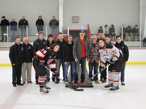 On Saturday, Dec 27th the Islanders held there Alumni Night starting with a Ceremonial Opening face-off. This is the Islanders 10th season at the Al MacInnis Sports Center and each player in the picture is representing one of those years.From Lt to Rt,